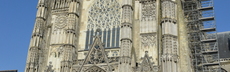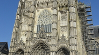 Hlavní fasáda je mnohem zdobnější, než bývá u gotiky obvyklé, katedrála se v průběhu staletí dostavovala, najdeme tu barokní a dokonce i renesanční prvky, ale úžasné jsou i vitráže, kromě těch původních tu najdeme i vitráže z mnohem pozdější doby, některé dokonce z minulého století.